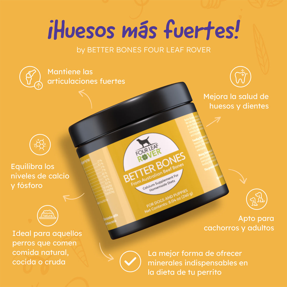Better Bones es la elección inteligente para proteger la salud ósea de tu perro, desde cachorro hasta adulto. Dale el soporte que necesita para mantenerse activo y fuerte.