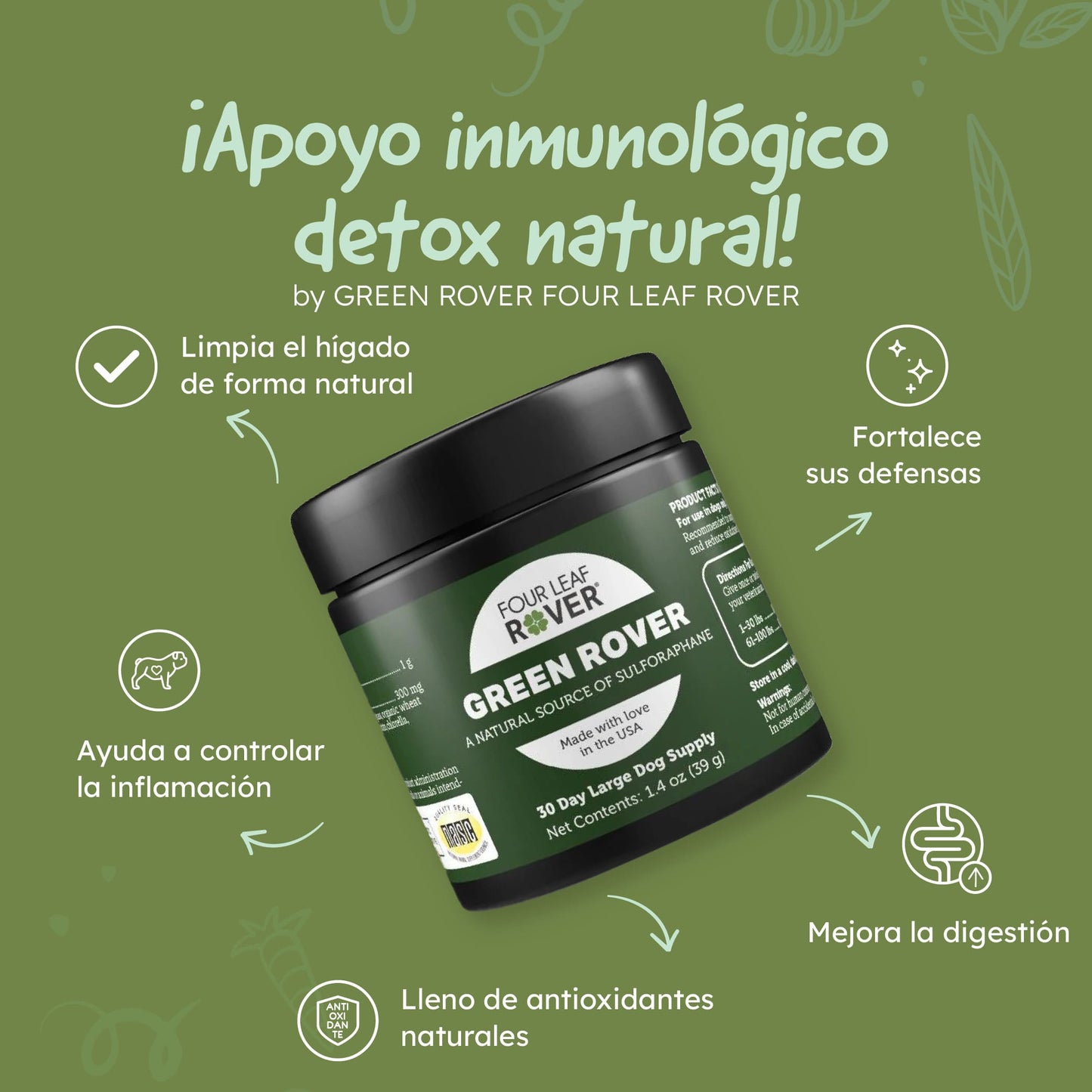Green Rover es un suplemento 100% natural diseñado por veterinarios para reforzar defensas, controlar inflamación y eliminar toxinas acumuladas del cuerpo.